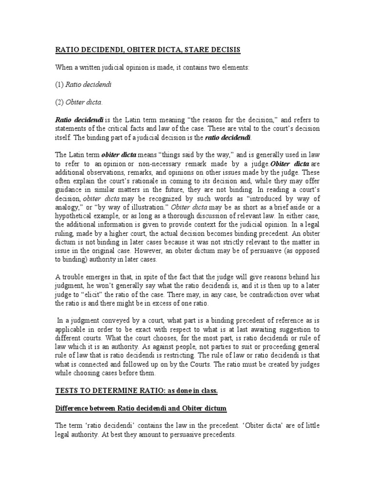 Ratio Decidendi Obiter Dicta And Stare Decisis